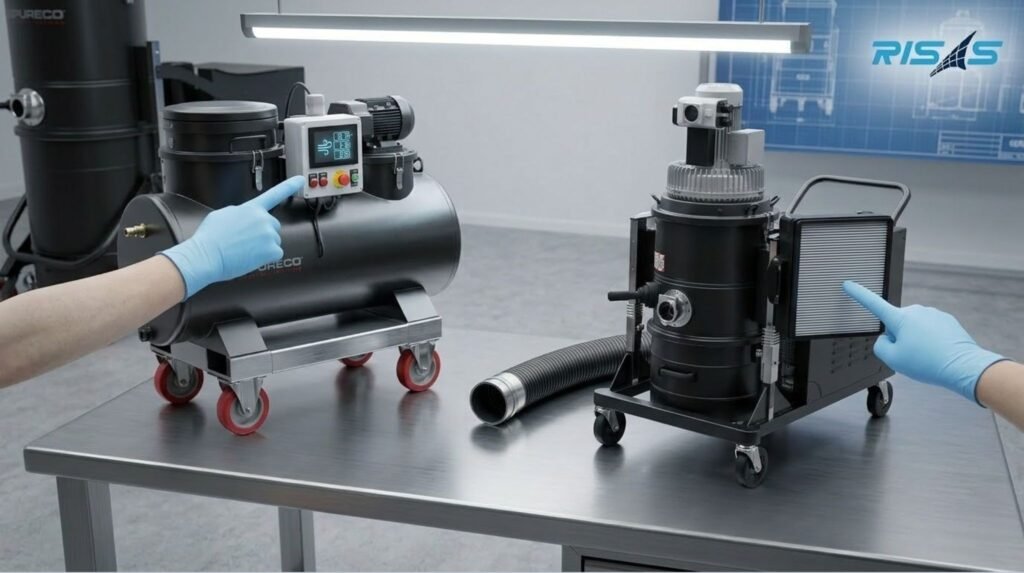 According to the RISAS industrial vacuum catalog, these systems help industries safely remove dust, liquids, and hazardous materials while improving plant hygiene and operational efficiency.